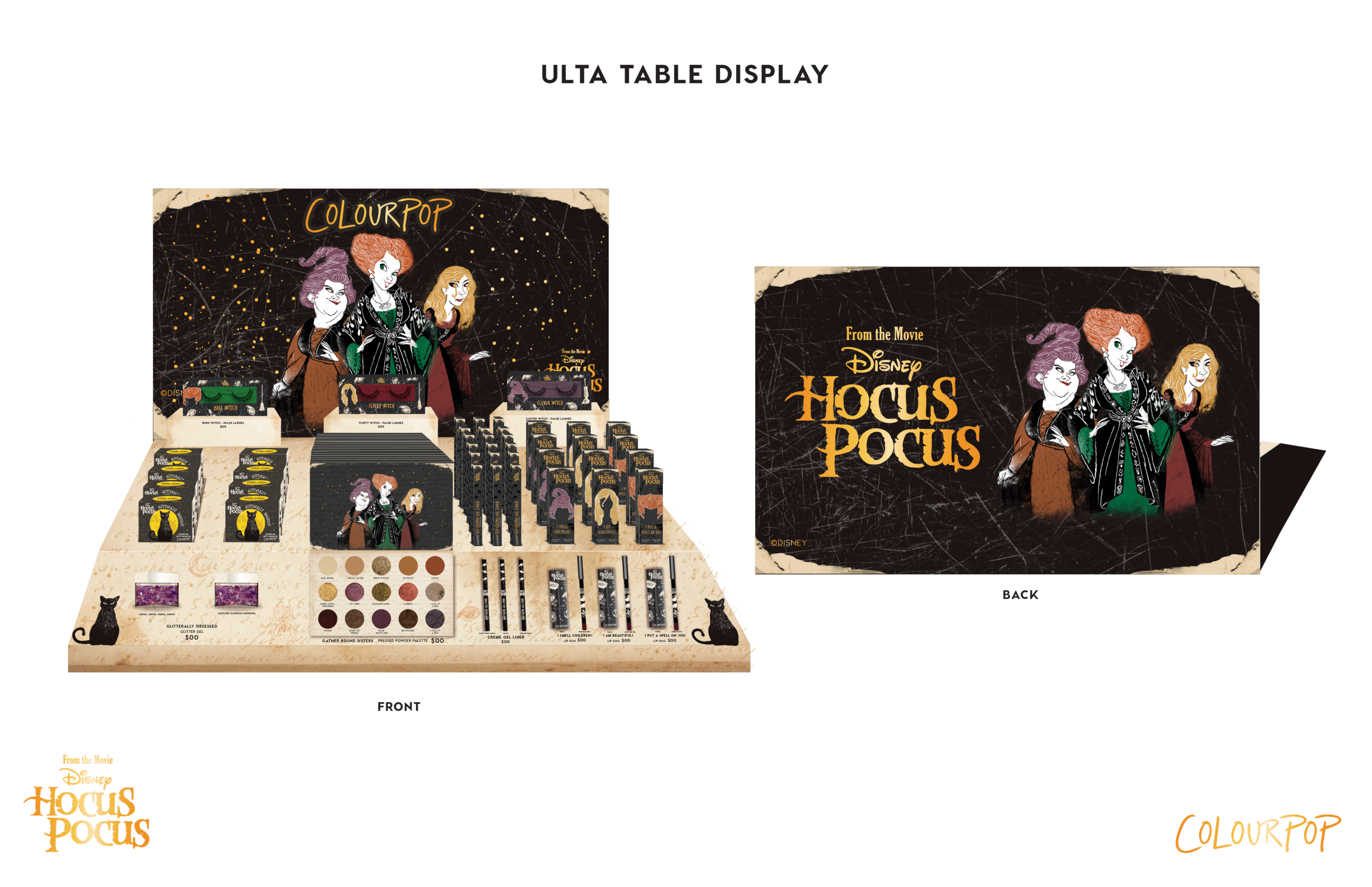 One of my favorite collections I have designed is Colourpop's collaboration with Disney's Hocus Pocus. I lead this collection conceptually, as well as executed all packaging for production. I was really inspired by the assets provided by Disney. I incorporated iconic touches to the packaging that pay homage to the movie, such as having "boooook" from the movie be an integral part in the palette. I worked with Disney's style guide and Colourpop's brand to create this magical and nostalgic collection. I was responsible for concept, design, and production set up of all packaging.